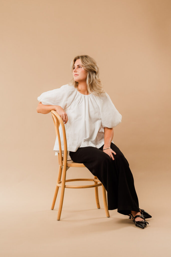Nina came into her personal branding shoot feeling a little uncomfortable in front of the camera, unsure of what to expect. We kept things simple, relaxed, and low-pressure, shooting in our home studio (aka Wonderstudio) using a warm tan backdrop.